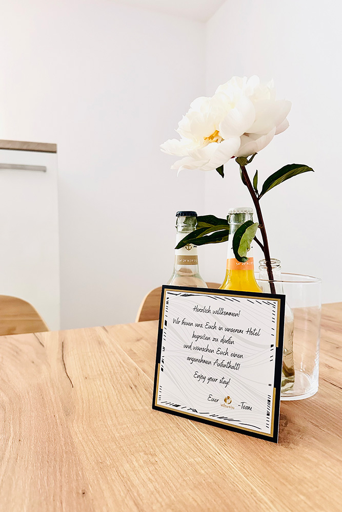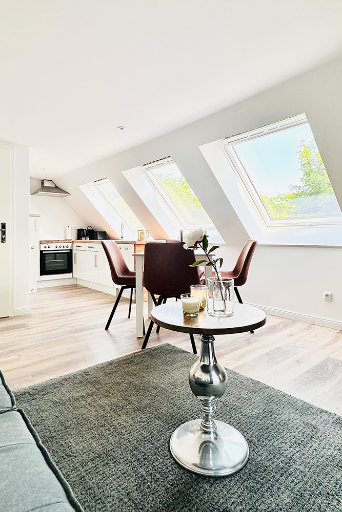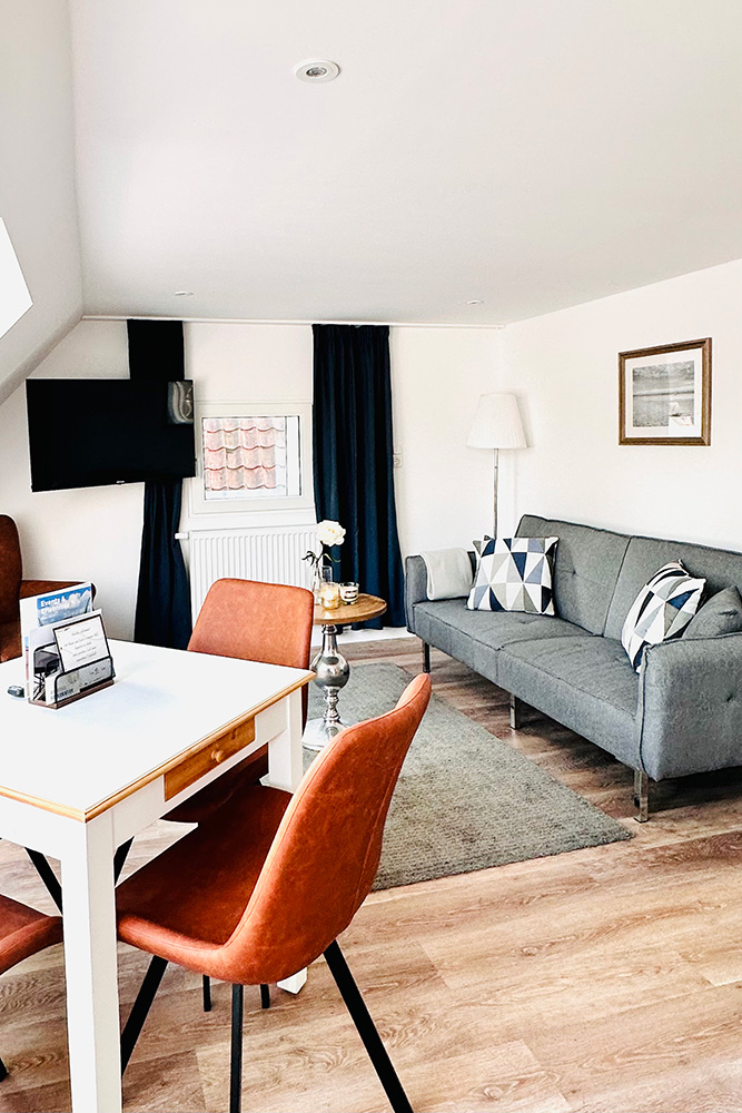 Das großzügige, komfortabel eingerichtete Apartment verfügt über eine extra große Küche mit einem großen Esstisch.Die Terrasse bietet einen schönen Gartenblick.Fellnasen sind hier herzlich willkommen.Ein kostenfreier Parkplatz steht am Hotel Wellenreiter zur Verfügung.